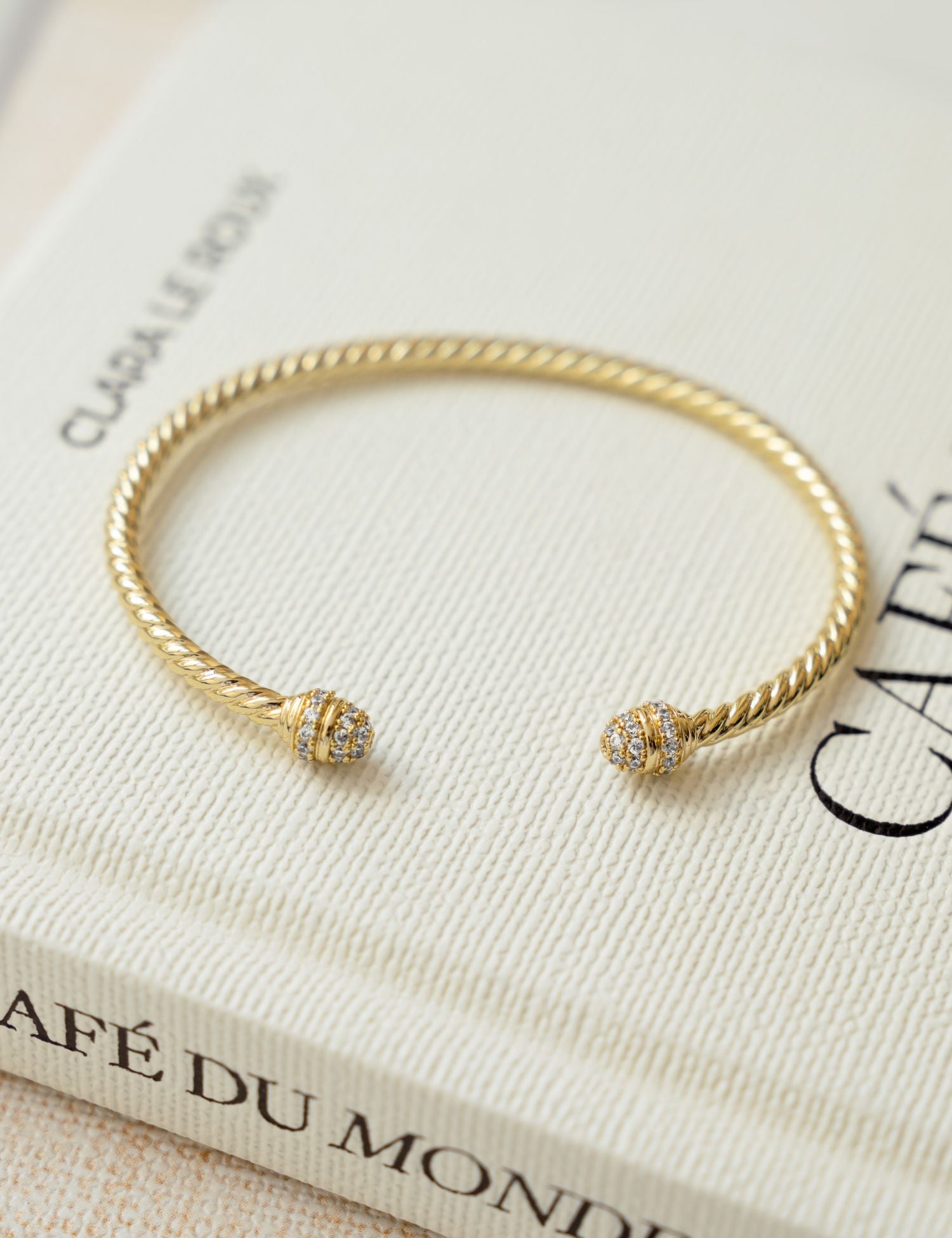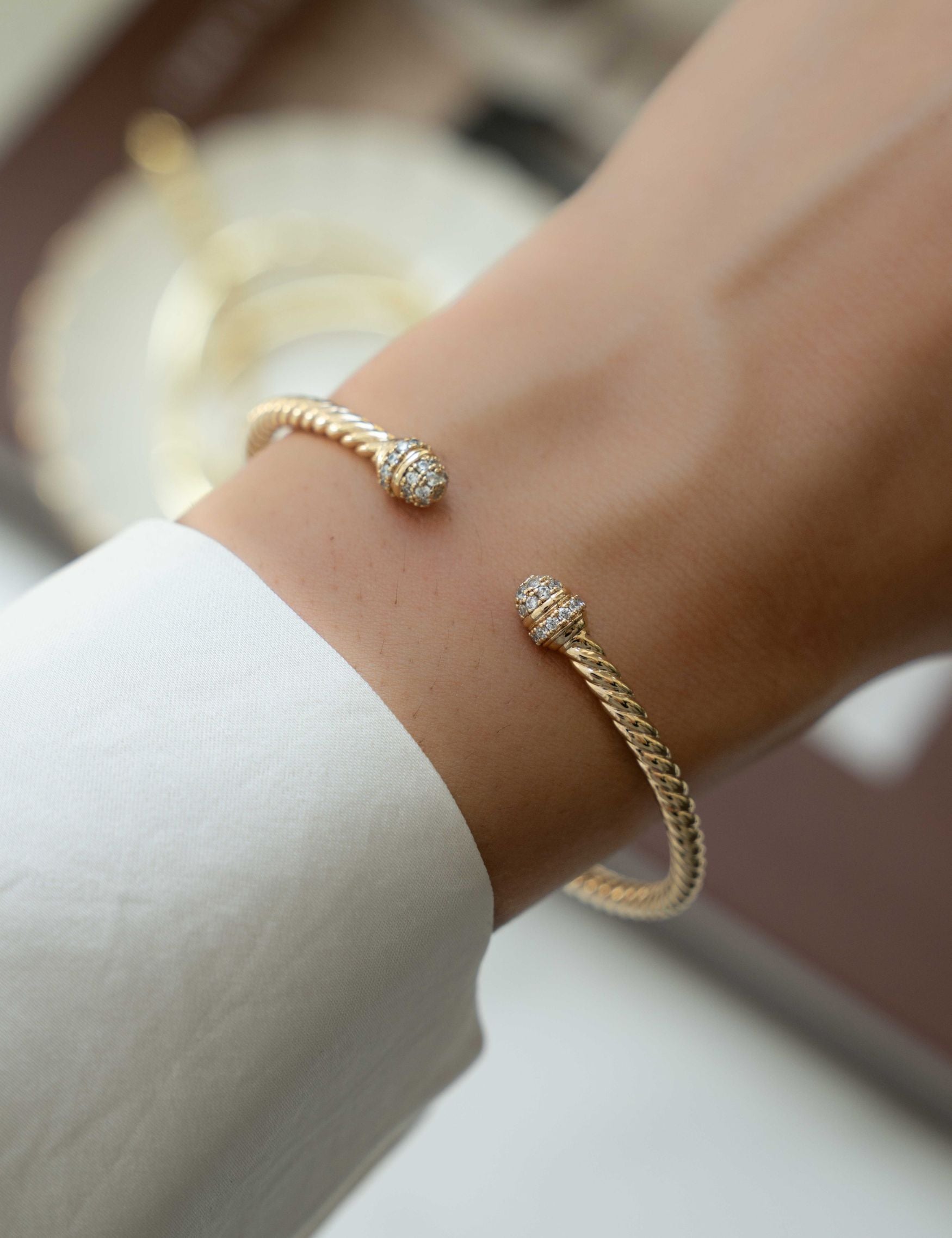 Add that luxe feel to your look with this twisted bangle cuff bracelet. This stunning adjustable bangle features a spiral design and just the right amount or sparkle! It's the perfect stackable bracelet for everyday wear. With its open cuff design and vintage-inspired details, its both minimalist and timeless!