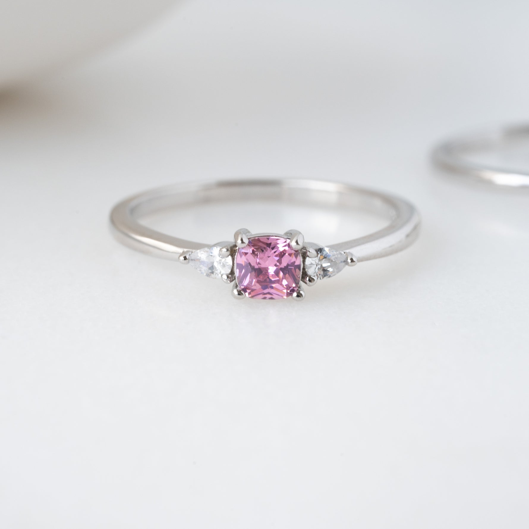 Unit price perSweet, simple, and dainty ring. Perfect for a minimalist look, or for stacking. It adds a fun pop of color to your look! Featuring a pink cushion cut stone with pear stones adorning both sides - making this a delicate and beautiful ring!